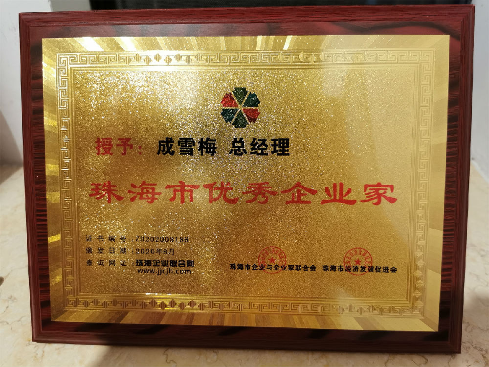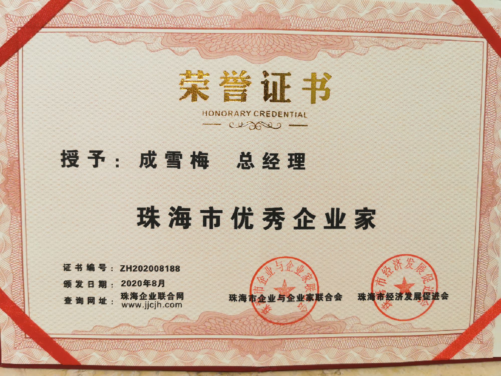 成雪梅总经理获得“珠海市优秀企业家 ”称号