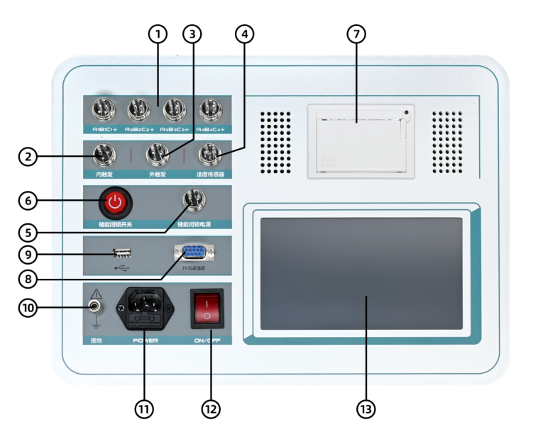 ⑵、7寸彩色高亮屏(亮度可调节),太阳底下操作也清晰可见。菜单式操作,快速测试界面,一键操作,支持中英文输入。12路断口状态中文显示,时间、行程、速度及波形同屏显示,无需翻页查看数据。分析指定段平均速度,并在行程曲线标出,方便查看。内置21种常规类型断路器速度定义,只需选择开关类型,一键测量。